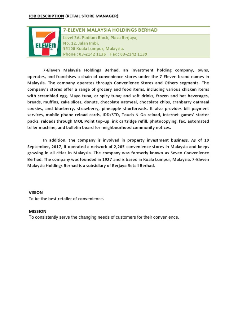 7 eleven owns and operates a chain of convenience stores that offers food snacks and beverages. The company was incorporated on 4 june 1984 7 eleven malaysia has made its mark in the retailing scene and have been a prominent icon for over 28 years. 7 eleven s president ceo joseph m. Statement 7 overall financial performance of the company 9 7 eleven malaysia holdings berhad name of company 7 eleven malaysia holdings berhad location head office level 3a podium block plaza berjaya 12 jalan imbi 55100 kuala lumpur malaysia tel.
