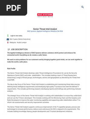 Senior Threat Intel Analyst Job Bae Systems Applied Intelligence Malaysia Sdn Bhd 3543849 Jobstreet Threat Computer Intelligence Analysis