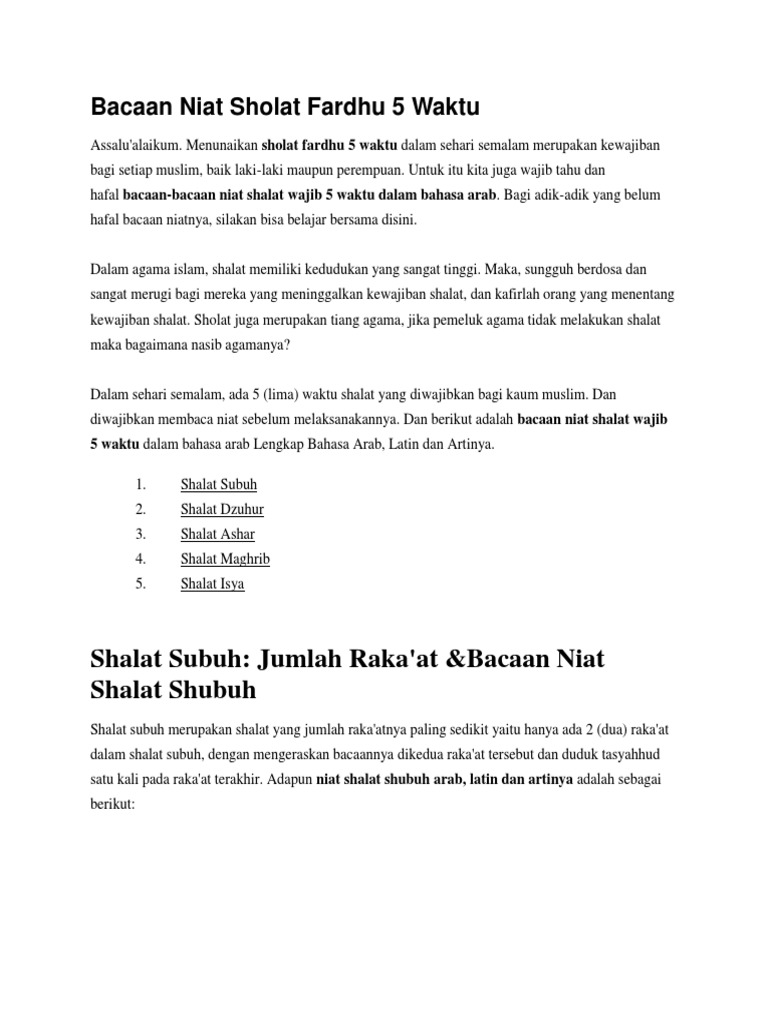Niat Shalat 5 Waktu