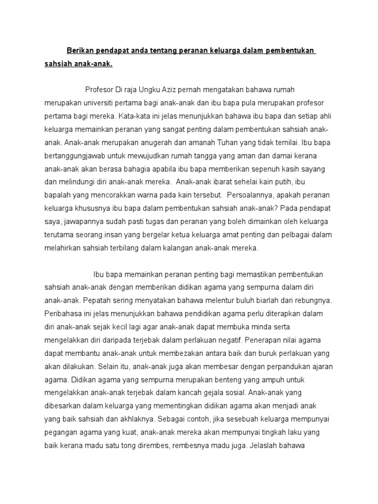 Oleh itu keluarga terutamanya ibu bapa memainkan peranan yang penting untuk membentuk keperibadian anak anak. Karangan spm peranan ibu bapa dalam membentuk sahsiah anak anak peranan ibu bapa dalam membentuk sahsiah anak anak dewasa ini dalam era globalisasi yang kian mencabar gejala sosia semakin berleluasa dan merunsingkan. Jadikan sabda iman al ghazali sebagai iktibar iaitu mendidik anak anak umpama menanam biji benih. Kita melihat kes kes gejala sosial terpampang di dada akhbar mala disiarkan di kaca televisyen.
