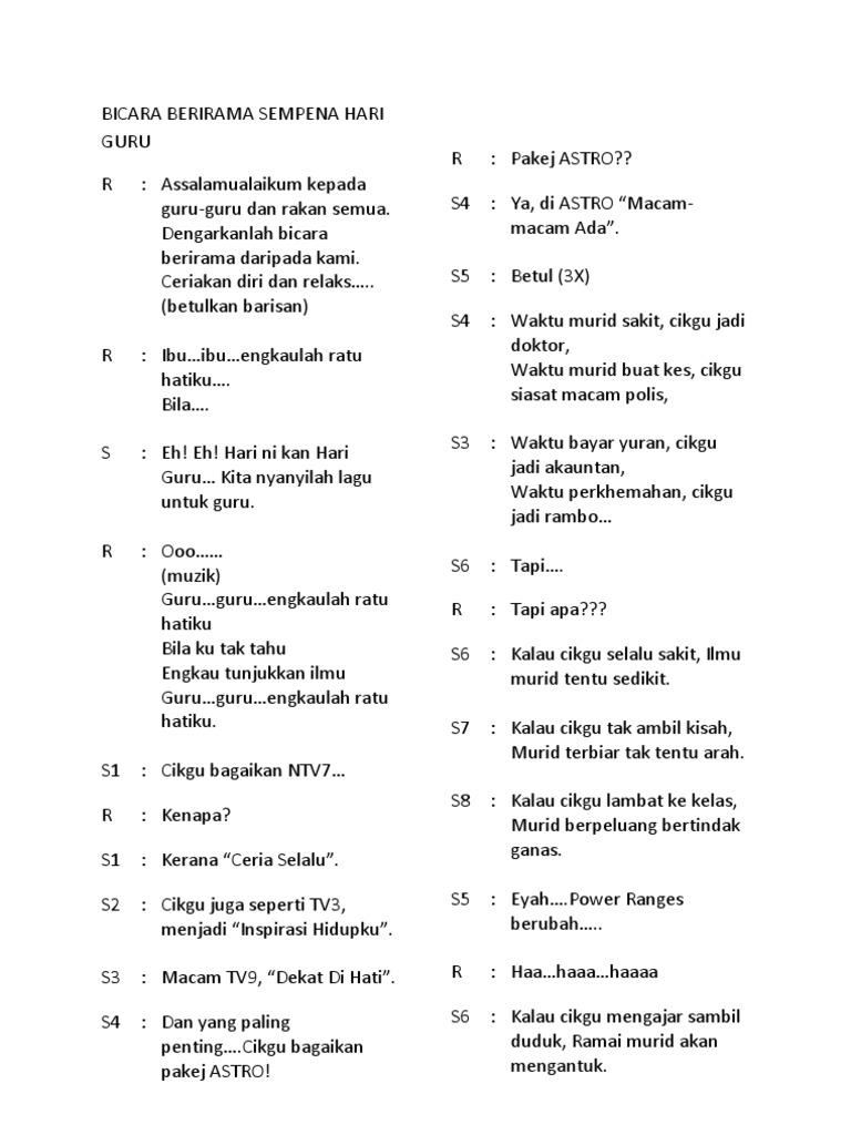 Usu is 21 812 views. Masih samar2 utk membuat skripnya cikgu wati reply delete. Terima kasih cikgu atas perkongsian ini. Cikgu mohon utk dijadikan panduan sek saya baru pertama kali ingin memasuki pertandingan bicara berirama nie.