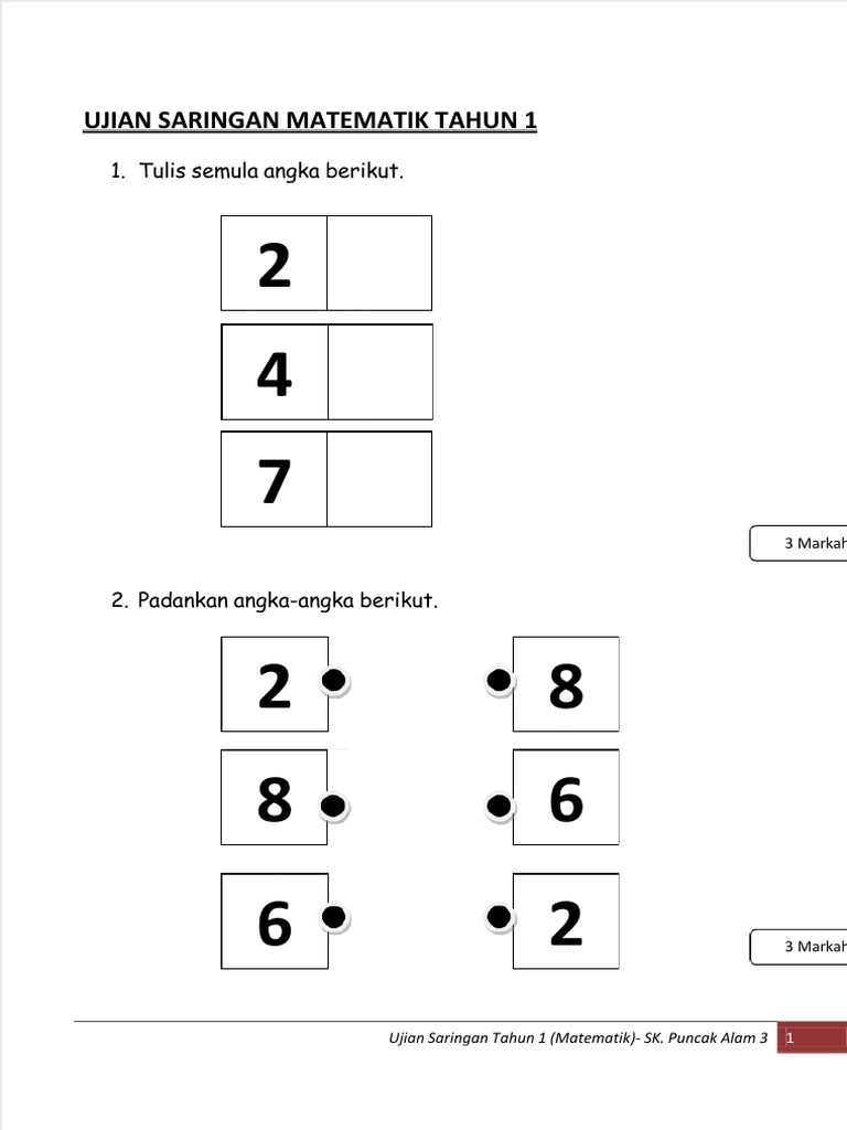 1 Tulis Semula Angka Berikut Ujian Saringan Matematik Tahun 1